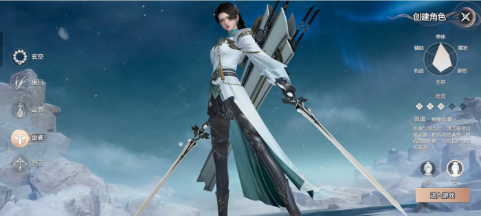游戏里面有五大职业,剑阁、云霓、唐门、玄空、烈羽,剑阁时近战外攻能抗能打,用的武器时剑匣还有三把剑,不同的剑可以提供不同的效果。重剑巨阙有控制和防御,干将莫邪单体高伤害,快...