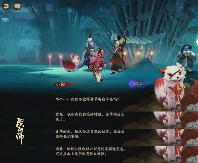 七角山秘闻剧情中是萤草帮助晴明寻找白狼,萤草受到过白狼的帮助,所以想要跟着白狼,但是萤草天生胆小害羞,不敢直接和白狼说,正好在白狼与妖刀姬陷入困境时晴明一行人找来,给了萤草报答白狼以及和白狼袒露自己心意的机会。